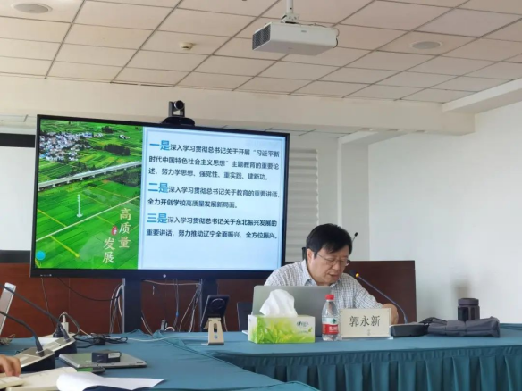 郭永新回顧了前一階段學(xué)校主題教育工作進(jìn)展情況。學(xué)校緊緊圍繞“學(xué)思想、強(qiáng)黨性、重實(shí)踐、建新功”總要求,把理論學(xué)習(xí)、調(diào)查研究、推動發(fā)展、檢視整改貫通起來,有機(jī)融合、一體推進(jìn),努力在深學(xué)細(xì)照篤行中提高理論素養(yǎng)、堅定理想信念、升華覺悟境界、增強(qiáng)能力本領(lǐng)。郭永新指出,推動高質(zhì)量發(fā)展,要從習(xí)近平新時代中國特色社會主義思想中汲取智慧和力量。要全面落實(shí)以學(xué)增智要求,在提升政治能力、思維能力、實(shí)踐能力中培育推動高質(zhì)量發(fā)展的生力軍。一是為信仰“提純”,把“看家本領(lǐng)”學(xué)到手,練就“政治鑒別”的“敏銳性”;二是為黨性“淬火”,把“興黨本領(lǐng)”學(xué)到手,練就“忠黨愛民”的“金剛身”;三是為事業(yè)“燃燒”,把“強(qiáng)國本領(lǐng)”學(xué)到手,練就“劈波斬浪”的“硬功夫”。郭永新強(qiáng)調(diào),推動高質(zhì)量發(fā)展,要深刻把握習(xí)近平新時代中國特色社會主義思想的世界觀和方法論。一是必須堅持人民至上,守好根本價值立場;二是必須堅持自信自立,彰顯內(nèi)在精神特質(zhì);三是必須堅持守正創(chuàng)新,弘揚(yáng)時代理論品格;四是必須堅持問題導(dǎo)向,把握創(chuàng)新源頭活水;五是必須堅持系統(tǒng)觀念,用好基本工作方法;六是必須堅持胸懷天下,展現(xiàn)新的格局境界。郭永新希望,廣大黨員在今后工作中能夠常態(tài)化跟進(jìn)學(xué)習(xí)黨的創(chuàng)新理論,持續(xù)開展調(diào)查研究,隨時檢視整改問題,進(jìn)一步用習(xí)近平新時代中國特色社會主義思想強(qiáng)基鑄魂、提升本領(lǐng)、推動工作,助力遼寧全面振興、全方位振興,著力培養(yǎng)擔(dān)當(dāng)民族復(fù)興大任的時代新人。