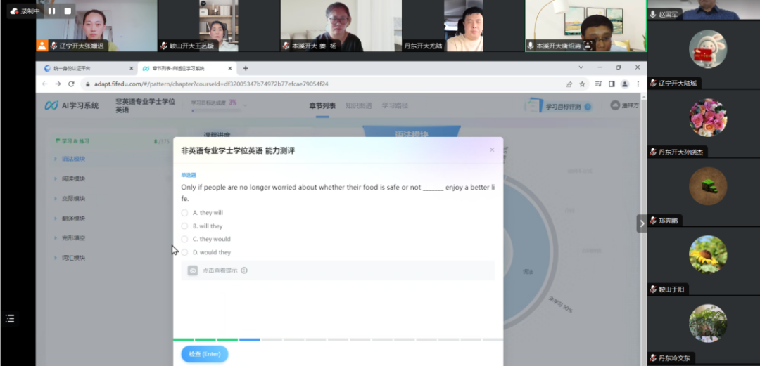 遼寧開放大學(xué)教學(xué)改革工作組老師解讀了學(xué)位英語考試相關(guān)政策和要求,本溪開放大學(xué)老師以學(xué)習(xí)者視角,向?qū)W生展示了人工智能的自適應(yīng)學(xué)習(xí)平臺(tái)。本溪開放大學(xué)學(xué)生代表作學(xué)習(xí)經(jīng)驗(yàn)分享及表態(tài)發(fā)言。