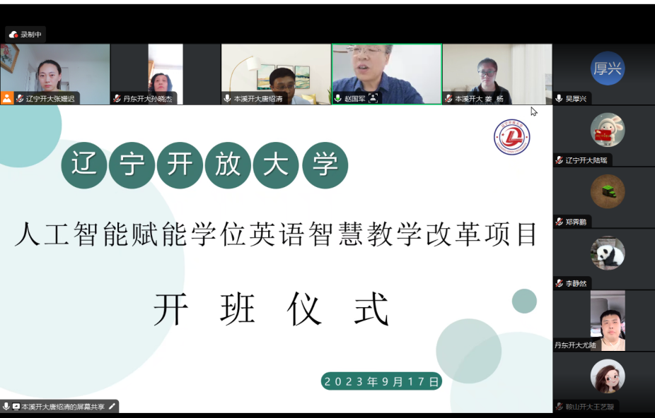 9月17日,遼寧開放大學(xué)以視頻會(huì)議形式舉辦“人工智能賦能學(xué)位英語智慧教學(xué)改革”開班儀式。國(guó)家開放大學(xué)外語教學(xué)部部長(zhǎng)鄭霽鵬,遼寧開放大學(xué)副校長(zhǎng)吳厚興出席并致辭,教務(wù)處相關(guān)工作負(fù)責(zé)人,試點(diǎn)市級(jí)開放大學(xué)相關(guān)工作負(fù)責(zé)人、導(dǎo)學(xué)教師、教學(xué)改革工作組項(xiàng)目全體教師、學(xué)生代表等參加開班儀式。開班儀式由校長(zhǎng)助理趙國(guó)軍主持。