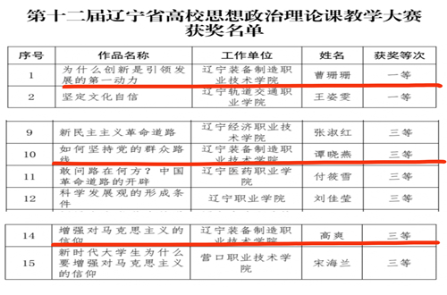2023年10月13日,第十二屆遼寧省高校思想政治理論課教學(xué)大賽決賽于沈陽遼寧大廈圓滿收官。本次大賽共有來自全省85所高校的364名選手參賽,經(jīng)過激烈角逐,我校教師曹珊珊在“習(xí)近平新時代中國特色社會主義思想概論”課程比賽中,以高職組第一名的成績獲得一等獎,譚曉燕、高爽老師分別獲得“毛澤東思想和中國特色社會主義理論體系概論”和“思想道德與法治”課程組三等獎,充分展示了我校思政課教師良好的精神風(fēng)貌和扎實的專業(yè)功底。