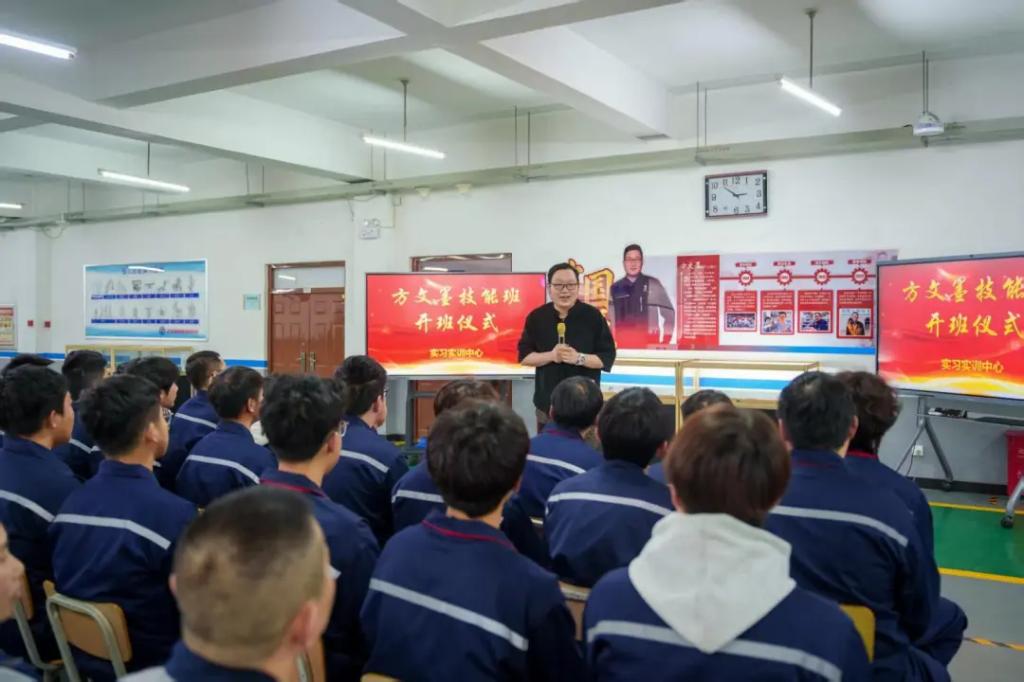 實(shí)習(xí)實(shí)訓(xùn)中心主任史立峰宣布方文墨技能班開(kāi)班,他介紹了成立方文墨技能班的過(guò)程和意義,方文墨技能班是以大國(guó)工匠方文墨擔(dān)任首席執(zhí)教教師的第二課堂活動(dòng),學(xué)生們利用課余時(shí)間開(kāi)展技術(shù)技能學(xué)習(xí)與訓(xùn)練。方文墨對(duì)學(xué)生提出了具體的學(xué)習(xí)要求,他鼓勵(lì)同學(xué)們珍惜這次學(xué)習(xí)機(jī)會(huì),勇于探索未知、不斷突破自我、追求卓越。