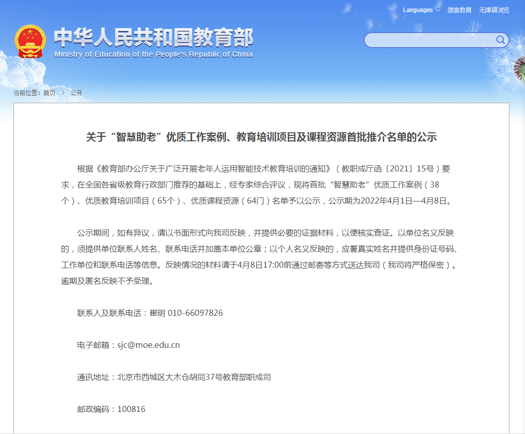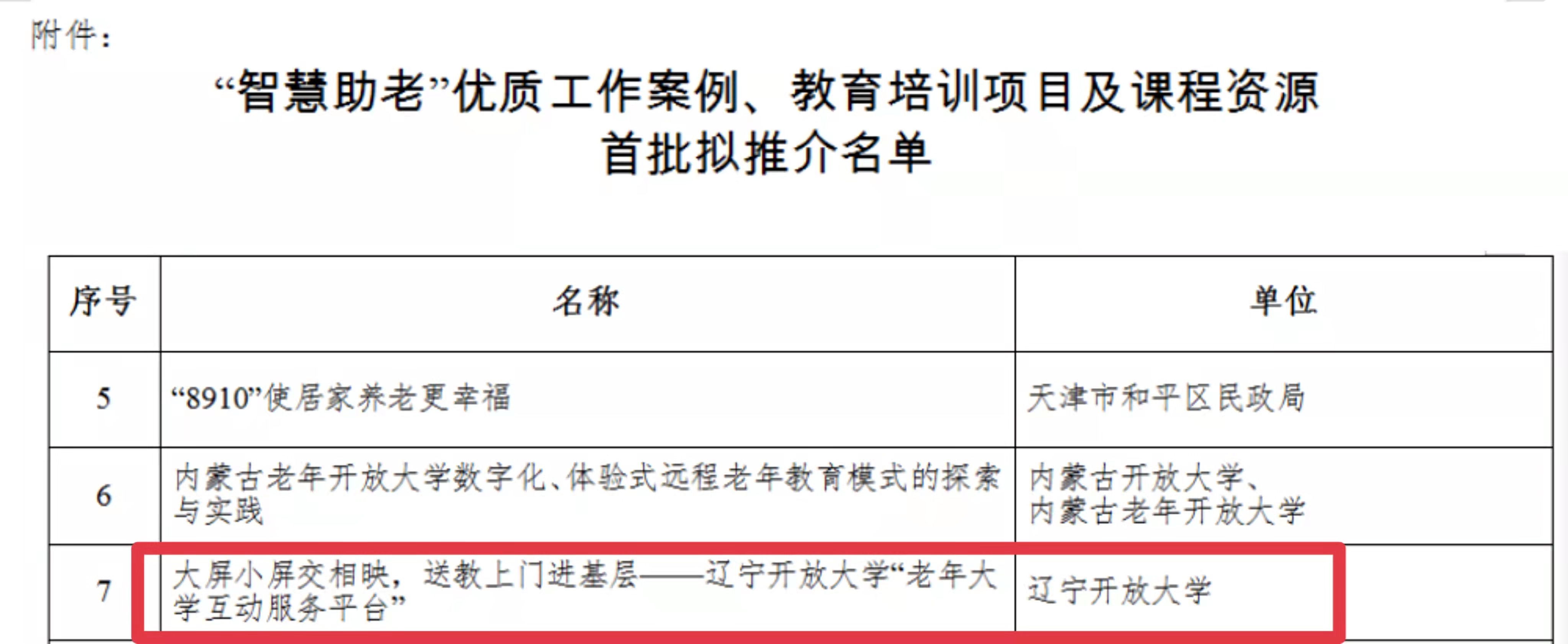 2022年4月1日,教育部網站發(fā)布了《關于智慧助老優(yōu)質工作案例、教育培訓項目及課程資源首批推介名單的公示》,遼寧開放大學的《大屏小屏交相映,送教上門進基層——遼寧開放大學“老年大學互動服務平臺”》項目入選教育部“智慧助老”優(yōu)質工作案例,該項目是國家開放大學與中國廣播電視網絡集團有限公司戰(zhàn)略合作首個試點項目,也是我校探索“互聯(lián)網 有線電視網 線下教學”三位一體開展老年教育工作的實踐。
