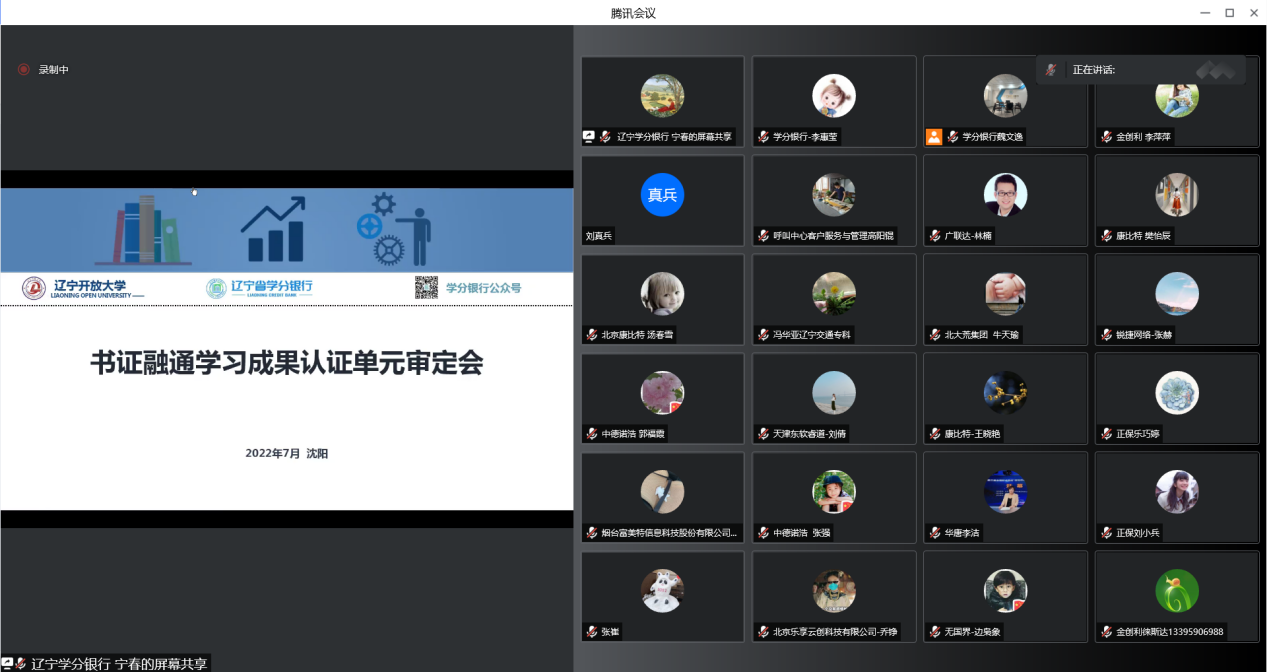 為深入貫徹落實(shí)《遼寧省教育廳辦公室關(guān)于開(kāi)展職業(yè)技能等級(jí)證書(shū)書(shū)證融通工作的通知》要求有序推進(jìn)遼寧省書(shū)證融通創(chuàng)新實(shí)踐工作進(jìn)程,學(xué)分銀行管理中心于7月13日召開(kāi)2022年度書(shū)證融通學(xué)習(xí)成果認(rèn)證標(biāo)準(zhǔn)審定工作會(huì),會(huì)議由管理中心主任寧春主持,采用視頻方式進(jìn)行,學(xué)分銀行認(rèn)證標(biāo)準(zhǔn)專(zhuān)家、相關(guān)培訓(xùn)評(píng)價(jià)組織負(fù)責(zé)人、相關(guān)證書(shū)標(biāo)準(zhǔn)專(zhuān)家等50余人參加會(huì)議。