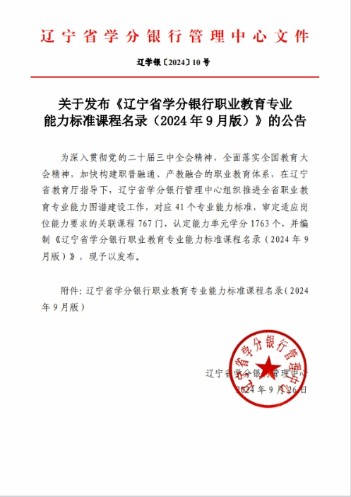 為深入貫徹黨的二十屆三中全會精神,全面落實全國教育大會精神,加快構(gòu)建職普融通、產(chǎn)教融合的職業(yè)教育體系,在 遼寧省教育廳指導(dǎo)下,遼寧省學(xué)分銀行管理中心組織推進(jìn)全省職業(yè)教育專業(yè)能力圖譜建設(shè)工作,對應(yīng) 41 個專業(yè)能力標(biāo)準(zhǔn),審定適應(yīng)崗位能力要求的關(guān)聯(lián)課程 767 門,認(rèn)定能力單元學(xué)分 1763 個,并編制《遼寧省學(xué)分銀行職業(yè)教育專業(yè)能力標(biāo)準(zhǔn)課程名錄(2024 年 9 月版)》,現(xiàn)予以發(fā)布。