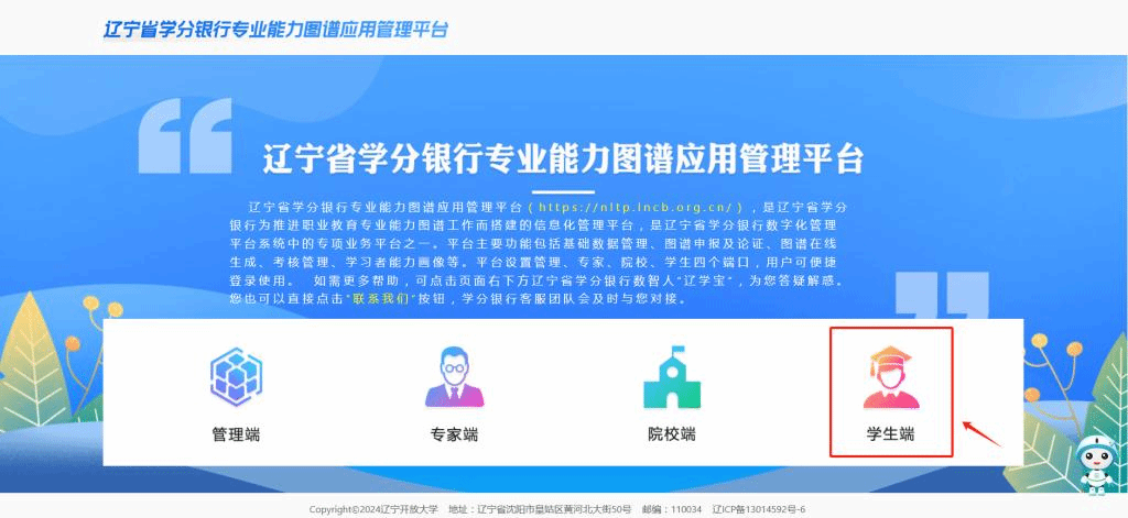 方式二:PC端     登錄遼寧省學(xué)分銀行專業(yè)能力圖譜應(yīng)用管理平臺(https://nltp.lncb.org.cn/)進(jìn)入學(xué)生端,點(diǎn)擊“能力畫像”點(diǎn)擊“下載個人能力畫像”,使用手機(jī)掃描“遼學(xué)寶”二維碼,查收個人能力畫像報(bào)告!